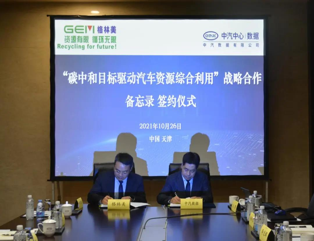 On October 26, 2021, GEM and CATARC signed in Tianjin the MOU of strategic cooperation on “carbon neutrality targets motivate comprehensive use of automotive resources”. The signing ceremony was attended by CATARC President Feng Yi, CATARC Eco-business Department Manager Xu Shujie, GEM Vice President Zhang Yuping and GEM Tianjin Industrial Park GM Zhang Zhenzhong, etc.