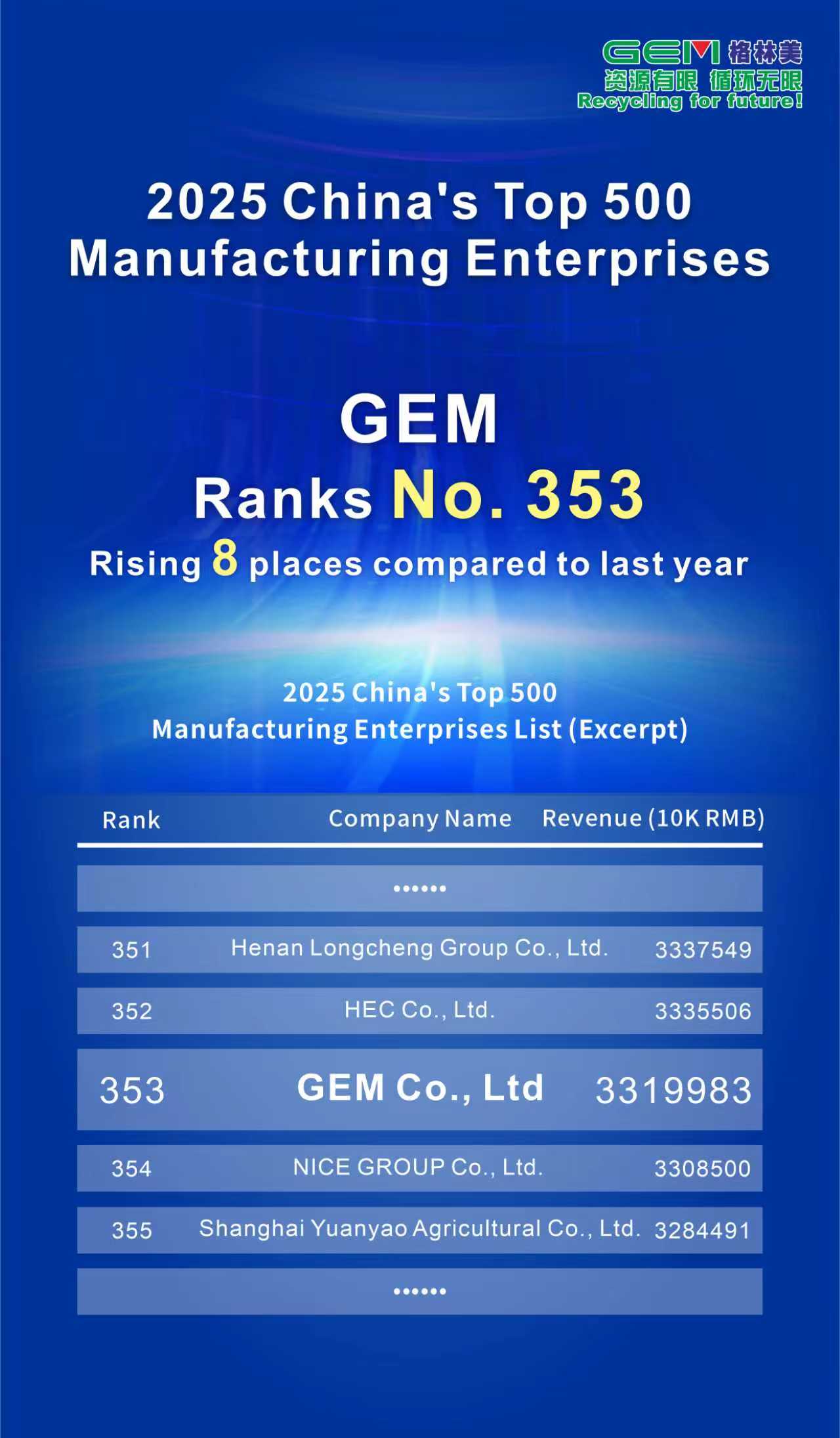 ▲ GEM menempati peringkat ke-353 dalam "500 Perusahaan Manufaktur Terbesar Tiongkok 2025"